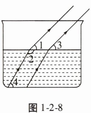 10. 光线在不同介质中的传播速度是不同的,因此光线从水中射向空气时,要发生折射。由于折射率相同,所以在水中的平行光线,在空气中也是平行的。如图1-2-8,若$\angle 2-\angle 1 = 75^{\circ}$,则$\angle 3$与$\angle 4$的度数和是