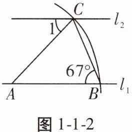 3. 如图1-1-2,直线$l_{1}// l_{2}$,以直线$l_{1}$上的点A为圆心、适当长为半径画弧,分别交直线$l_{1},l_{2}$于点B,C,连接AC,BC。若$∠ABC= 67^{\circ }$,则$∠1$的度数为()