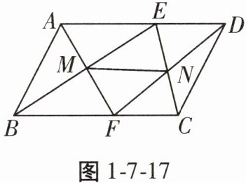 19. 如图1-7-17,在▱ABCD中,E,F分别是AD,BC上的点,且$DE= CF$,BE和AF的交点为M,CE和DF的交点为N。求证:$MN// AD,MN= \frac {1}{2}AD$。