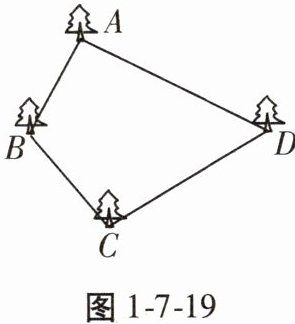 21. 张大伯承包了一个四边形的池塘,如图1-7-19,它的四个角A,B,C,D处均有一棵核桃树,张大伯今年养鱼喜获丰收,明年准备把池塘面积扩大一倍,但又不想毁掉这四棵大树,并且扩建后的池塘呈平行四边形形状。张大伯这一设想是否能实现?请你帮助他解决一下,画出草图,并说明理由。