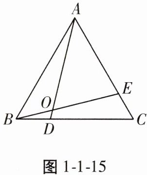 18. 如图1-1-15,$△ABC$是等边三角形,且$BD= CE$,求$∠AOE$的度数。