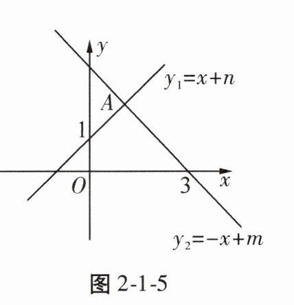 14. 如图2-1-5,直线$y_{1}= x+n$与y轴交于点$(0,1)$,直线$y_{2}= -x+m$与x轴交于点$(3,0)$,两直线交于点A。不等式$x+n≥-x+m$的解集为____。