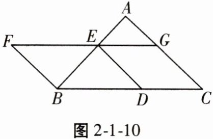 22. (8分)如图2-1-10,以BC为底边的等腰三角形ABC,点D,E,G分别在BC,AB,AC上,且$EG// BC,DE// AC$,延长GE至点F,使得$BE= BF$。求证:四边形BDEF为平行四边形。