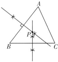 解:因为要满足$PA=PB=PC$,所以点$P$是线段$AB$,$BC$垂直平分线的交点。如图所示,只要作$AB$,$BC$的垂直平分线,它们的交点就是早市$P$的位置。