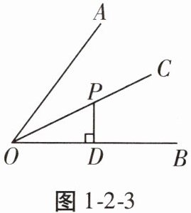 2. 如图 1 - 2 - 3,点 P 是∠AOB 的平分线 OC 上的一点,PD⊥OB,垂足为 D。若 PD = 2,则点 P 到边 OA 的距离是()