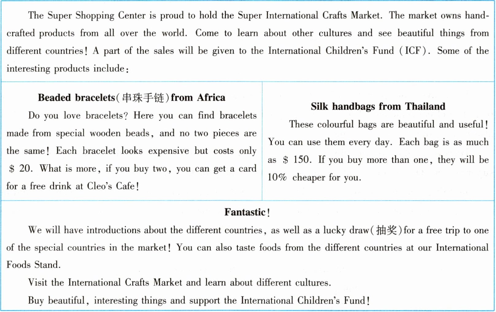 )3. The products of the Super International Crafts Market don't include ______.A. wooden beaded bracelets