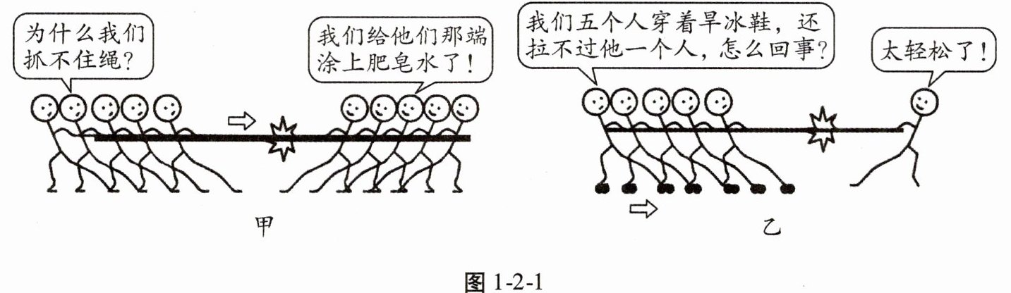 2. 试着用摩擦力的物理知识来解释图 1 - 2 - 1 所示漫画《不公平的拔河》中左侧同学们的疑问。