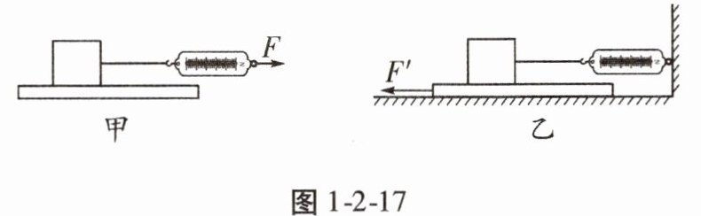 (2)在图 1 - 2 - 17 甲实验中发现,很难保持木块在(1)小题中的运动,且弹簧测力计的示数不稳定。于是,同学们对实验装置进行了改进。如图 1 - 2 - 17 乙所示,将弹簧测力计水平固定,通过拉力$F'$拉动长木板进行实验,实验数据记录如表所示。