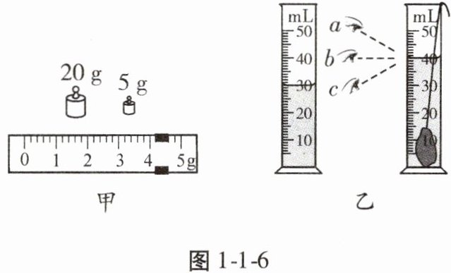 5. 小西和同学们用天平、量筒等实验器材和足量的水测量小石块的密度。当天平平衡时所用砝码及游码位置如图1-1-6甲所示,并用如图1-1-6乙所示的方法测量小石块的体积。下列说法正确的是