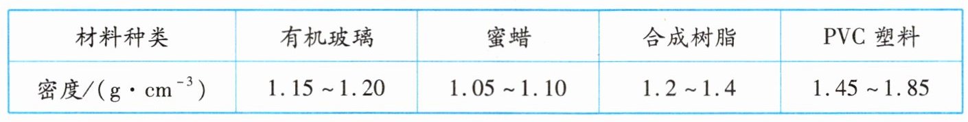 8. 小智和妈妈在寒假外出旅游时购买了一块蜜蜡首饰,由于市面上有商贩会用树脂、玻璃等材料以假充真,所以他准备鉴别一下首饰的真假。小智通过测量得出首饰的密度为1.08g/cm³。下表是小智上网查阅的部分材料的密度,可知该首饰的材料为