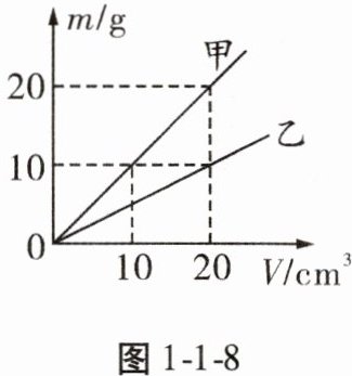 11. 如图1-1-8所示为甲、乙两种物质的m-V图像,则体积为20cm³的甲物质的质量为____g,乙物质的密度是____kg/m³。