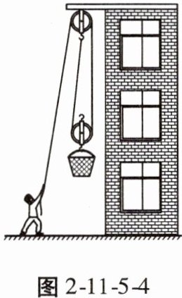 5. 如图2 - 11 - 5 - 4所示,工人利用滑轮组将重为600N的沙子从地面匀速提升到6m高的三楼,已知拉力F的大小为400N。求: