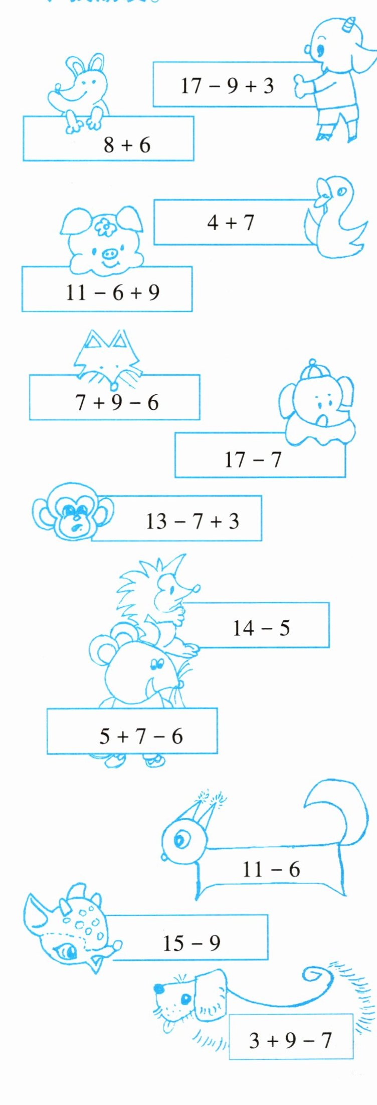 - 计算$8 + 6 = 14$;$17−9 + 3 = 8 + 3 = 11$;$4 + 7 = 11$;$11−6 + 9 = 5 + 9 = 14$;$7 + 9−6 = 16−6 = 10$;$17−7 = 10$;$13−7 + 3 = 6 + 3 = 9$;$14−5 = 9$;$5 + 7−6 = 12−6 = 6$;$11−6 = 5$;$15−9 = 6$;$3 + 9−7 = 12−7 = 5$。