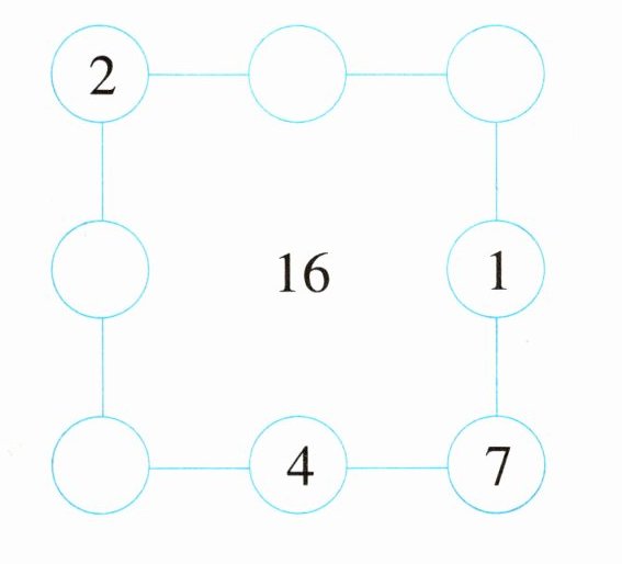 2. 在下图中的$◯$里填数,使每条线上的三个数相加都等于图中间的数。