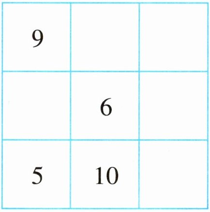 1. 在下图中的格子里填数,使每一横行、每一竖行和每一斜行上的三个数相加都等于18。