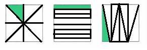 1. 拿出3张同样大小的正方形纸,分别折出它的$\frac {1}{8}$,并涂上颜色,你有几种不同的折法?动手操作后,请在下面的三个正方形中画出示意图。