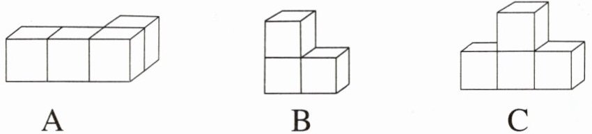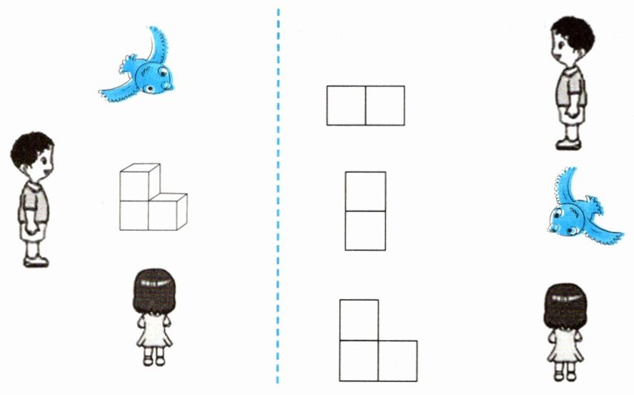 【解析】:从不同方向观察物体,小男孩从正面看,看到的形状是下面两个正方形,上面左边一个正方形;小女孩从上面看,看到的是两个并排的正方形;小鸟从侧面看,看到的是两个上下排列的正方形。