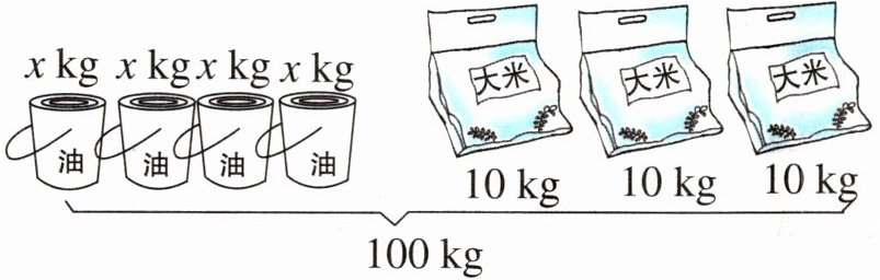 4 桶油的质量 + 3 袋大米的质量 = 100 千克