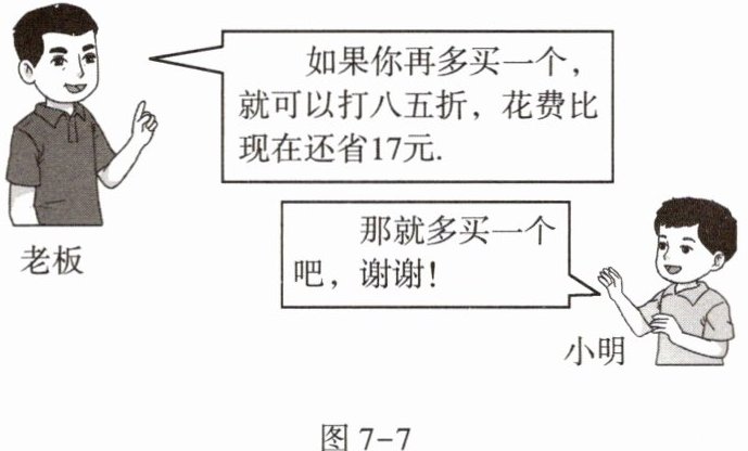 13. 某校开展校园艺术节系列活动,派小明到文体超市购买若干个文具袋作为奖品.这种文具袋标价每个10元,请认真阅读结账时老板与小明的对话(图7-7):