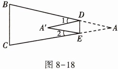 6. 如图8-18,$ D, E 是 \triangle A B C 的边 A B $,$ A C $上一点,把$ \triangle A B C 沿 D E $折叠,当点$ A 落在四边形 B C E D 内部的点 A ^ { \prime } $时,则$ \angle A 与 \angle 1 + \angle 2 $之间的数量关系是 ( )