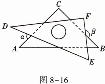 4. 小明把一副含$ 45 ^ { \circ }, 30 ^ { \circ } $的直角三角板按如图8-16摆放,其中$ \angle C = \angle F = 90 ^ { \circ } $,$ \angle A = 45 ^ { \circ }, \angle D = 30 ^ { \circ } $,则$ \angle \alpha + \angle \beta $等于( )