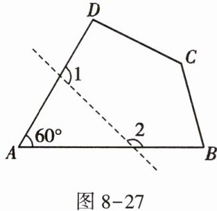 8. 如图 8 - 27,在四边形 ABCD 中,若去掉一个$60^{\circ }$的角得到一个五边形,则$∠1+∠2$的度数为____.