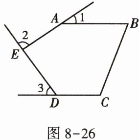 4. 如图 8 - 26,在五边形 ABCDE 中,$AB// CD,∠1,∠2,∠3分别是∠BAE,∠AED,∠EDC$的外角,则$∠1+∠2+∠3$的度数为 ( )