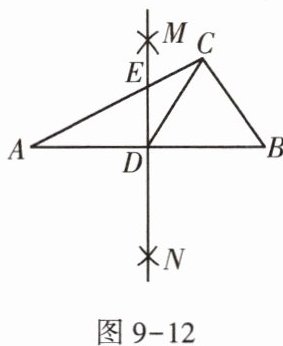 3. 如图9-12,在△ABC中,分别以点A和点B为圆心,以相同的长(大于$\frac{1}{2}AB$)为半径作弧,两弧相交于点M和点N,作直线MN交AB于点D,交AC于点E,连接CD。已知△CDE的面积比△CDB的面积小5,则△ADE的面积为( )