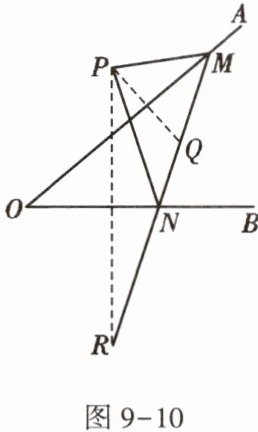 5. 如图9-10,P是∠AOB外的一点,M,N分别是∠AOB两边上的点,点P关于OA的对称点Q恰好落在线段MN上,点P关于OB的对称点R落在MN的延长线上。若PM = 2cm,PN = 3cm,MN = 3.5cm,则线段QR的长为( )