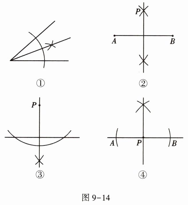 5. 图9-14是四种基本尺规作图,其中图9-14①是作已知角的平分线;图9-14②是作一条线段AB的垂直平分线;图9-14③是过直线外一点P作已知直线的垂线;图9-14④是过直线上一点P作已知直线的垂线。比较这些作图的方法,发现有一个共同点:原图(角、线段和直线)都是轴对称图形,而所作的图形都是原图形的______。