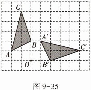 7. 在如图9-35所示的方格纸(1格长为1个单位长度)中,$△ABC$的顶点都在格点上,将$△ABC$绕点O按顺时针方向旋转得到$△A'B'C'$,使各顶点仍在格点上,则其旋转角的度数是 _ .