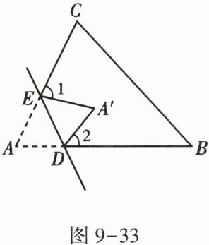 5. 如图9-33,在折纸活动中,小明制作了一张$△ABC$纸片,点D,E分别在边AB,AC上,将$△ABC$沿着DE折叠压平,A与$A'$重合,若$∠A= 65^{\circ }$,则$∠1+∠2$的度数为 ( )