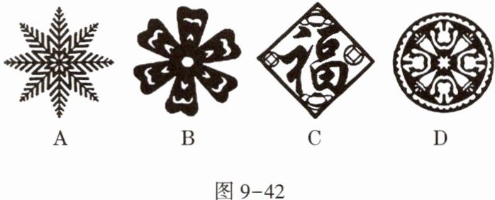 1. 剪纸是我国具有独特艺术风格的民间艺术,反映了劳动人民对现实生活的深刻感悟. 图9-42所示的四个剪纸图形不是中心对称图形的是 ( )