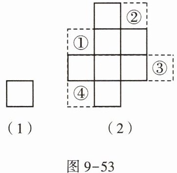 11. 图9-53(1)和图9-53(2)中所有的小正方形都全等,将图9-53(1)的正方形放在图9-53(2)中①②③④的某一位置,使它与原来7个小正方形组成的图形是轴对称图形,并且只有一条对称轴,这个位置是______(填序号).