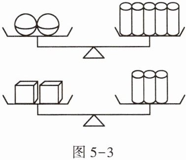 6. 某电视栏目中,有一期中的一道题目如图5 - 3所示,两个天平都平衡,则3个球体的质量等于____个正方体的质量( )