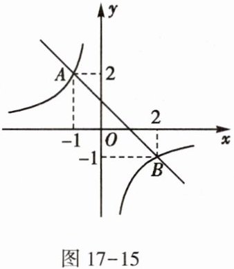 1. 如图17-15,一次函数$y_1=kx+b(k\neq0)$的图象与反比例函数$y_2=\frac{m}{x}(m$为常数且$m\neq0)$的图象都经过$A(-1,2),B(2,-1)$,结合图象,则不等式$kx+b>\frac{m}{x}$的解集是 (
