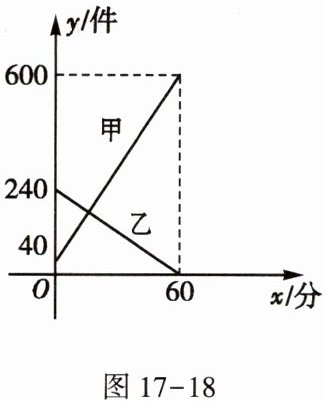 5. 某快递公司每天上午$9:00\text{~}10:00$为集中揽件和派件时段,甲仓库用来揽收快件,乙仓库用来派发快件,该时段内甲、乙两仓库的快件数量$y$(单位:件)与时间$x$(单位:分)之间的函数图象如图17-18所示,那么当两仓库快件数量相同时,此刻的时间为 (