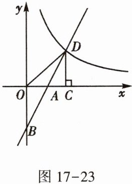3. 如图17-23,在平面直角坐标系中,直线$y=2x+b(b<0)$与坐标轴交于$A$,$B$两点,与双曲线$y=\frac{k}{x}(x>0)$交于$D$点,过点$D$作$DC\perp x$轴,垂足为$C$,连接$OD$. 已知$\triangle AOB\cong\triangle ACD$.