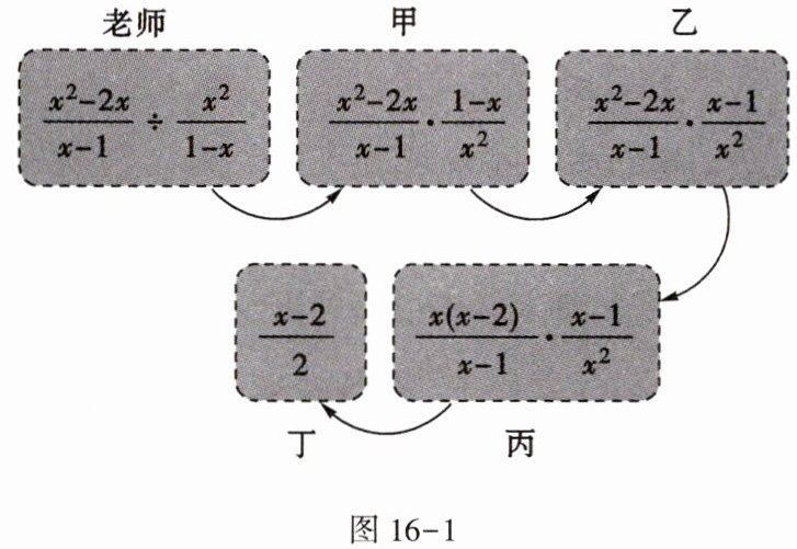 4. 老师设计了接力游戏,用合作的方式完成分式化简,规则是:每人只能看到前一人给的式子,并进行一步计算,再将结果传递给下一人,最后完成化简。过程如图16-1所示。接力中,自己负责的一步出现错误的是(