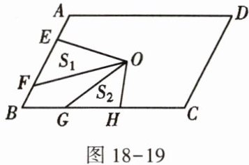 4. 如图 18-19,点 O 是□ABCD 的对称中心,$ AD > AB $,E,F 分别是 AB 边上的点,且 $ EF = \frac{1}{2}AB $,G,H 分别是 BC 边上的点,且 $ GH = \frac{1}{3}BC $,若 $ S_1 $,$ S_2 $ 分别表示 $ △EOF $ 和 $ △GOH $ 的面积,则 $ S_1 $,$ S_2 $ 之间的等量关系是________.