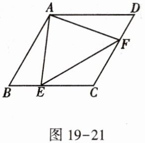 1. 如图19-21,在菱形ABCD中,$ \angle B = 60 ^ { \circ } $,点E,F分别从点B,D同时以同样的速度沿边BC,DC向点C运动. 给出以下四个结论: