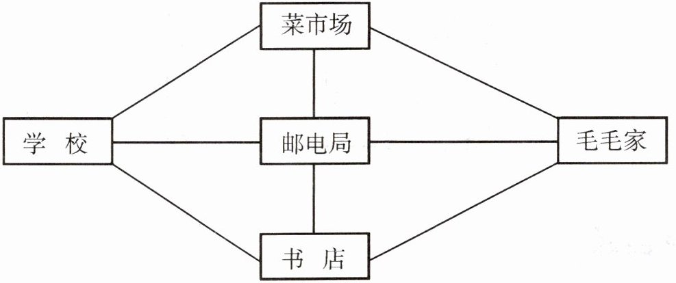 毛毛准备放学回家时到书店里买一本书,妈妈又让他买一些菜带回家。仔细看图,他怎么走才是最近的?