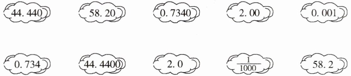 【答案】:$44.440$与$44.4400$相连;$58.20$与$58.2$相连;$0.7340$与$0.734$相连;$2.00$与$2.0$相连;$0.001$与$\frac{1}{1000}$相连。