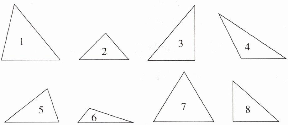 - 锐角三角形:三个角都小于$90^{\circ}$的三角形。观察图形可知$1$、$2$、$7$的三个角都小于$90^{\circ}$,所以是锐角三角形。