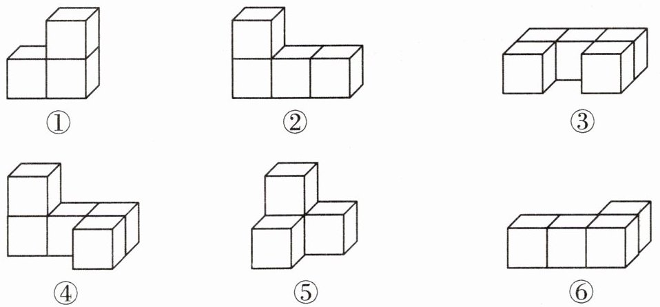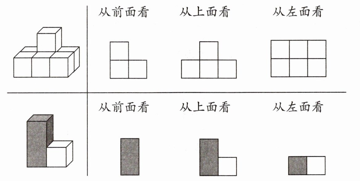 【解析】:根据立体图形从不同方向观察的形状特征进行连线。第一个立体图形从前面看是两层,下层两个正方形,上层左边一个正方形;从上面看是三个并排的正方形;从左面看是两排,每排三个正方形。第二个立体图形从前面看是一个长方形;从上面看是两层,下层一个正方形(深色),上层一个正方形(深色)和一个正方形(白色);从左面看是两个并排的正方形(一个深色一个白色)。