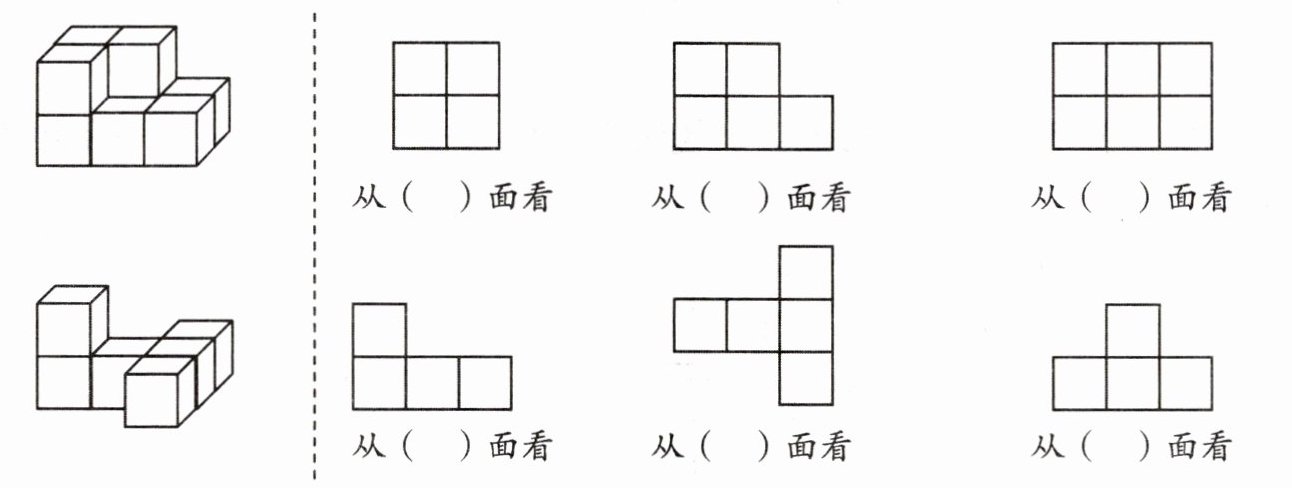 一、右边的三个图形分别是从什么方向看到的?填一填。