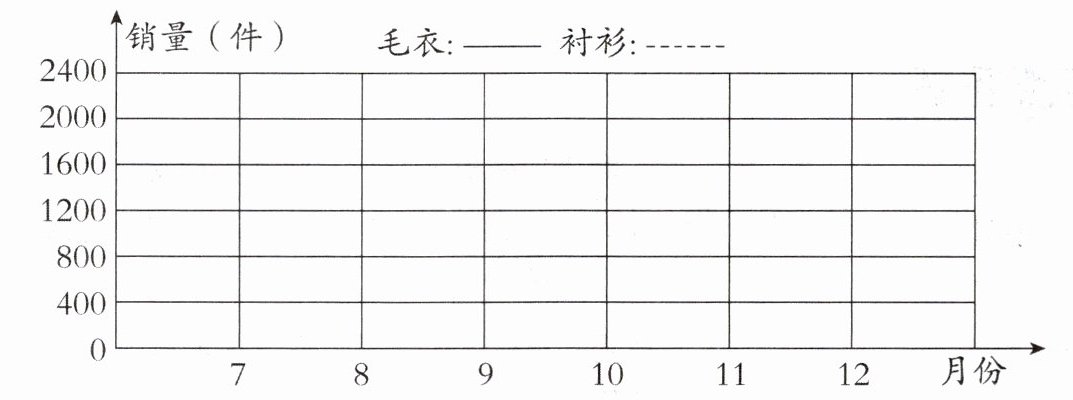 【解析】:根据统计表中的数据,在折线统计图中,毛衣销量从7月到11月呈上升趋势,11月到12月下降;衬衫销量从7月到12月呈下降趋势。
