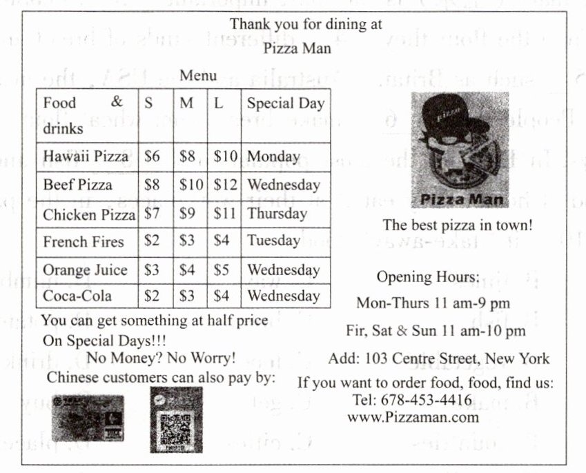 A. We can only order food in Pizza Man. B. We can have breakfast in Pizza Man. C. There's no special day on weekends.