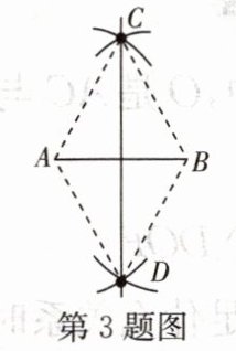 3. 如图,小红在作线段$AB$的垂直平分线时,是这样操作的:分别以点$A$、$B$为圆心,大于线段$AB$长度一半的长为半径画弧,相交于点$C$、$D$,则直线$CD$即为所求. 连结$AC$、$BC$、$AD$、$BD$,根据她的作图方法可知,四边形$ADBC$一定是 (