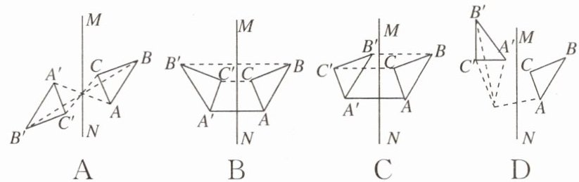 1. 下列图形中,$\triangle A'B'C'与\triangle ABC关于直线MN$成轴对称的是(